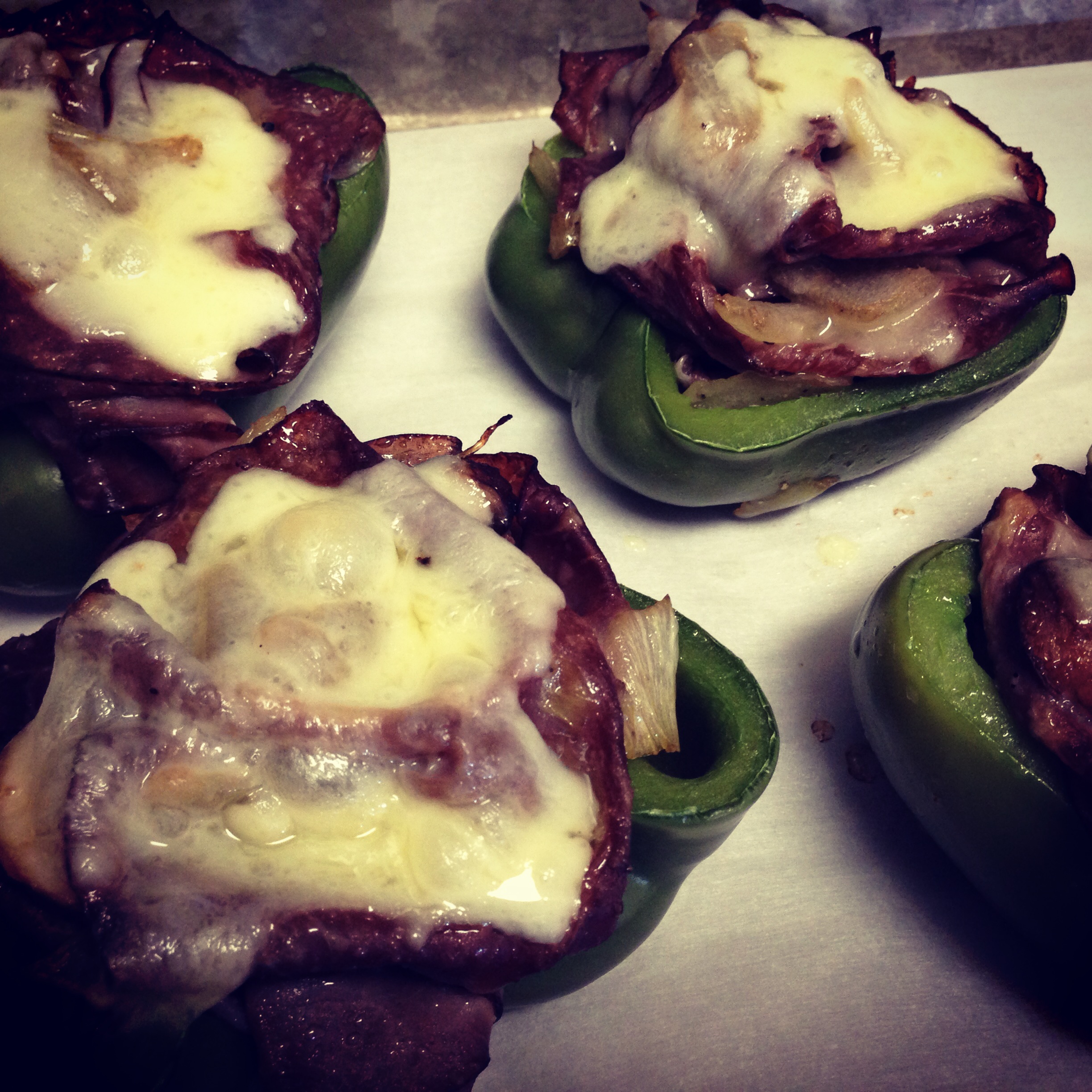 Place pepper halves on a parchment lined baking sheet. Fill with half of the cheese, then beef mixture. Top with remaining cheese. Place back under the broiler until cheese is melted and bubbly.