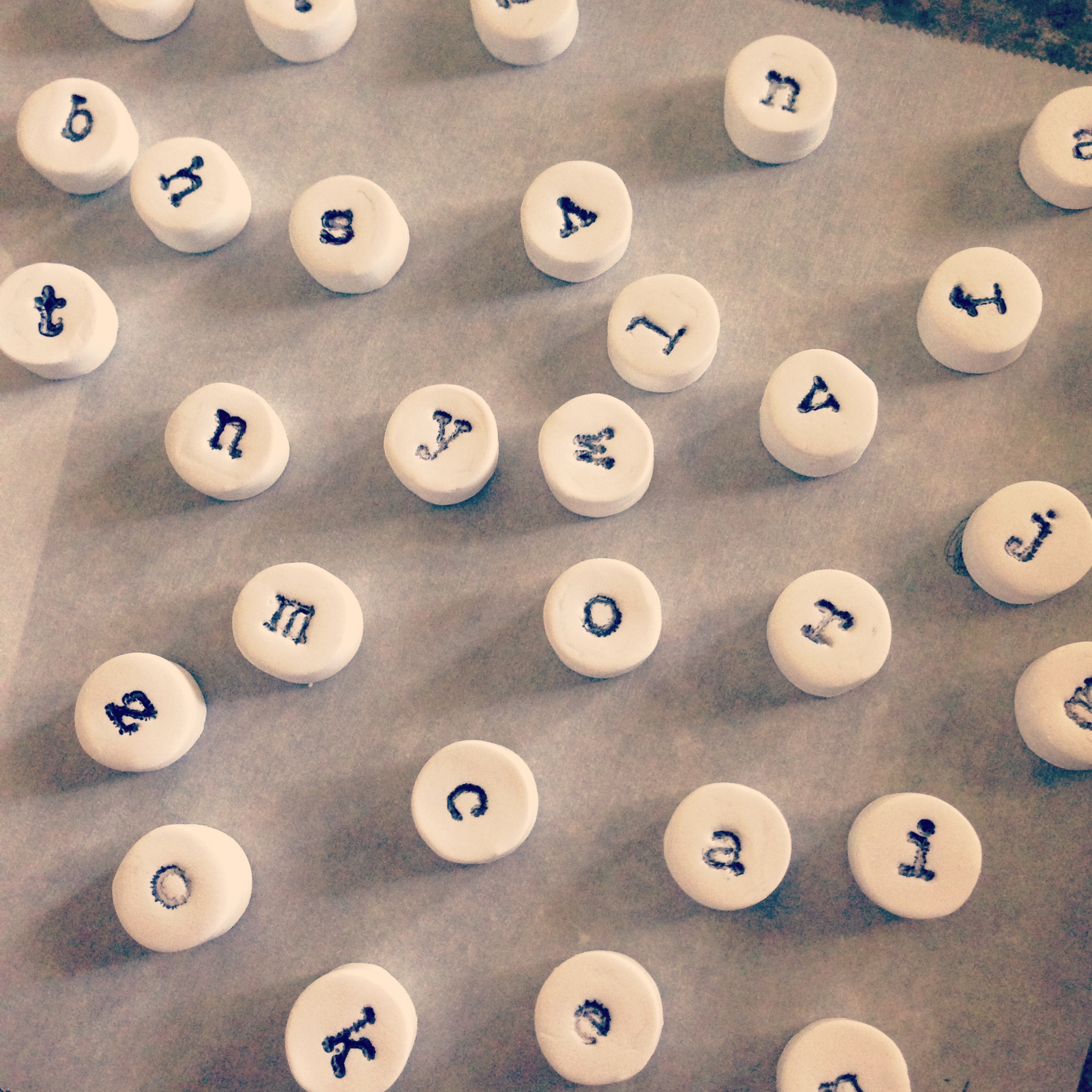 Press stamps into ink pad. Be careful to only coat the top of the letter with ink. Press the letter stamp into the clay circles. Make as many letters as you’d like for word building. Use a fine black sharpie marker to fill in any gaps of ink in the letters, if needed.