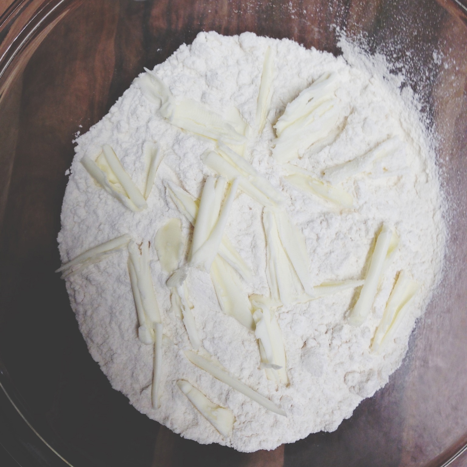 Preheat oven to 400F. Whisk together all dry ingredients in a large bowl.Grate cold butter (or cut it into ribbons) into dry ingredients. Stir butter into flour, then use a knife to cut the flour-coated butter into smaller pieces.