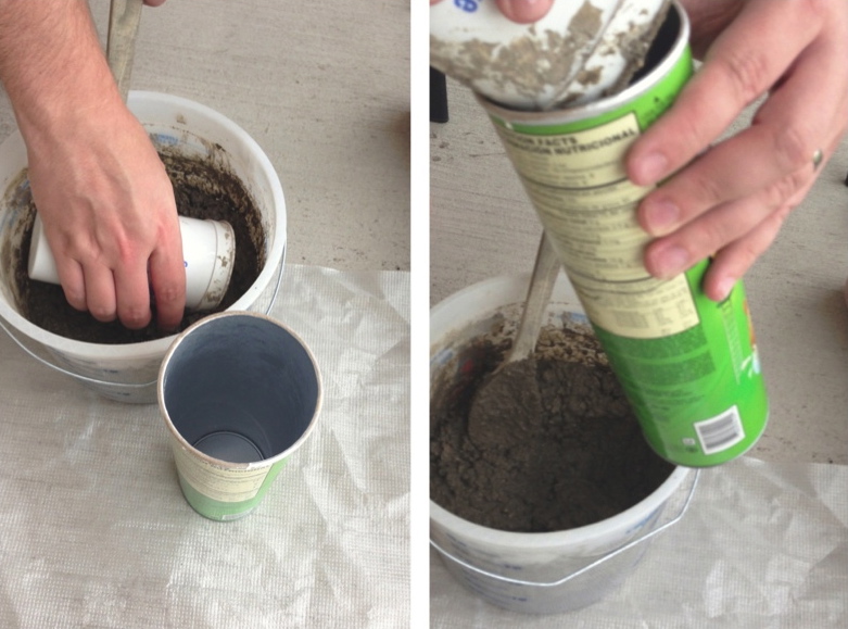 In a disposable container, mix up concrete according to directions on package. Funnel concrete into the pringles cans.