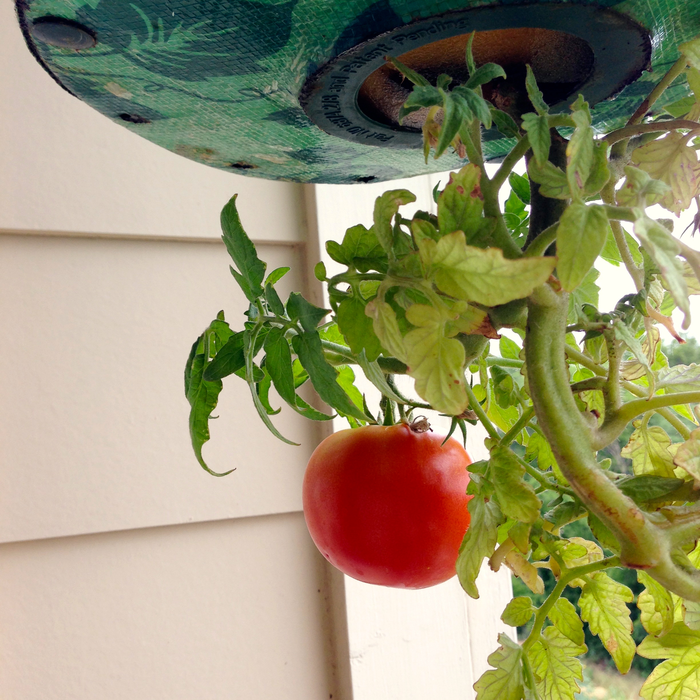 This year I bought the Topsy Turvy planter for planting tomatoes. I’m pretty happy with my $5 purchase, but my plant just isn’t taking off the way that I thought it would. I know that it’s only June, but this plant has been relatively the same size for the past two [hot, Texas] months. My plant has produced a BUNCH of blooms but this is only my second tomato to appear.