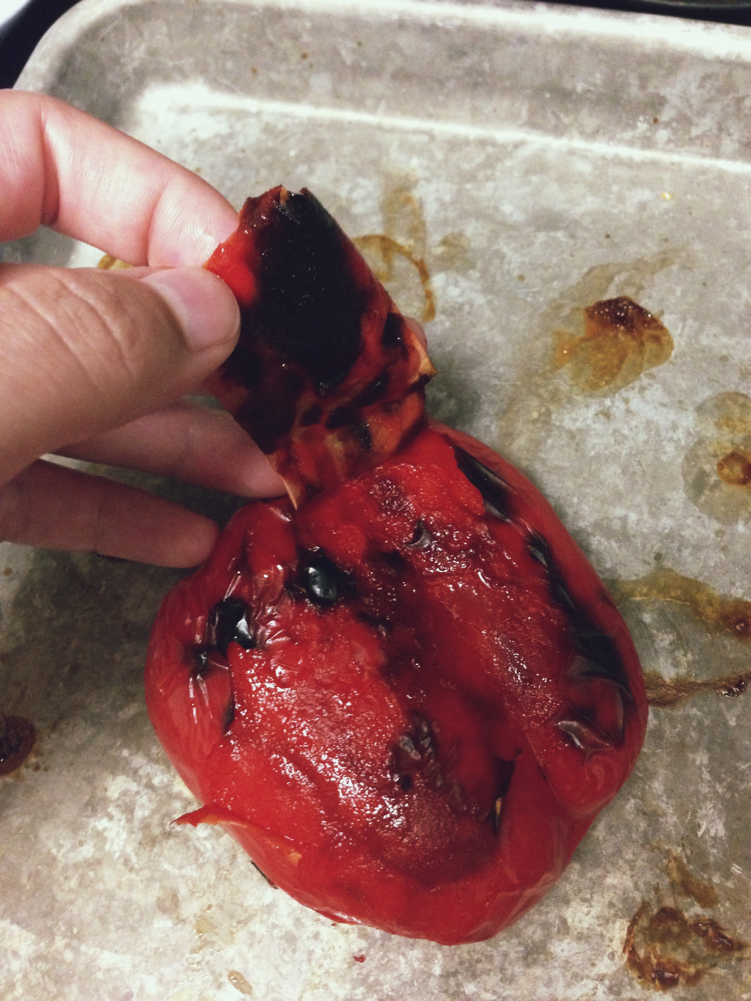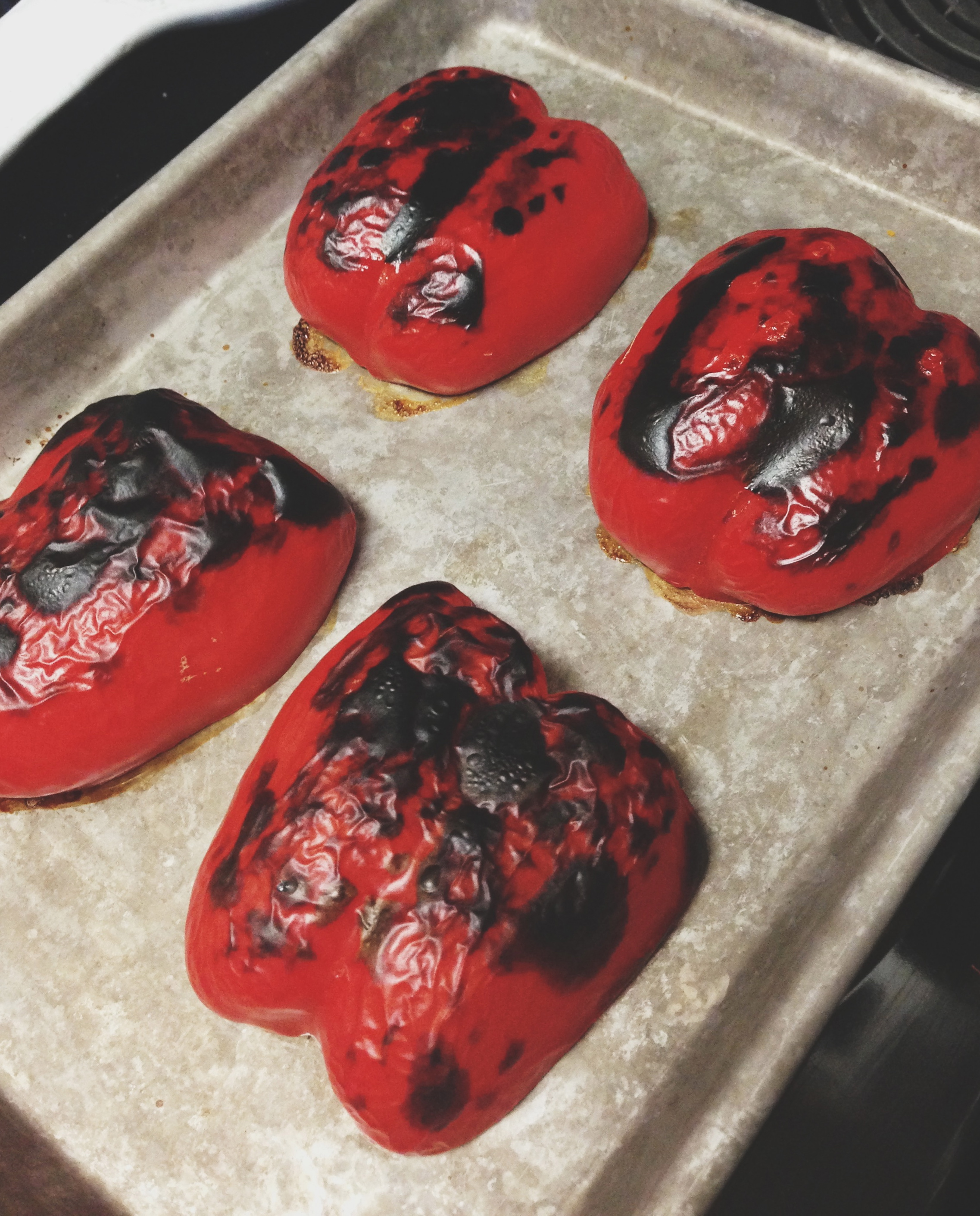 Keep an eye on the peppers and take them out of the oven once their skin has charred. Place peppers into a bowl and cover with plastic wrap (this will help the skins to separate from the peppers). After about 15 minutes (or when the peppers are cool enough to handle) remove the charred pepper skin.