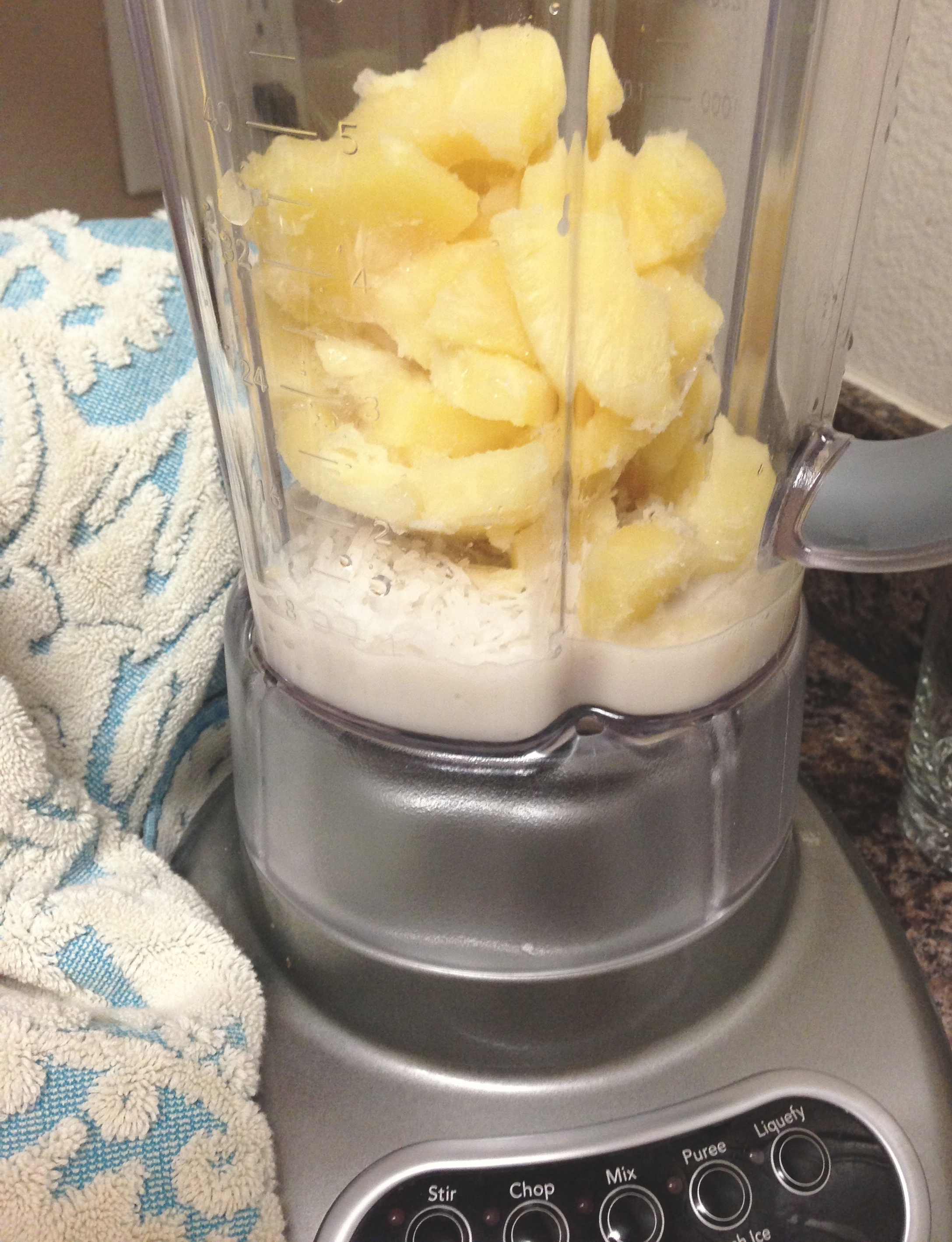 When you’re ready to make your smoothie, pull pineapple from the freezer and place in a blender. Add coconut and almond milk and blend until smooth.
