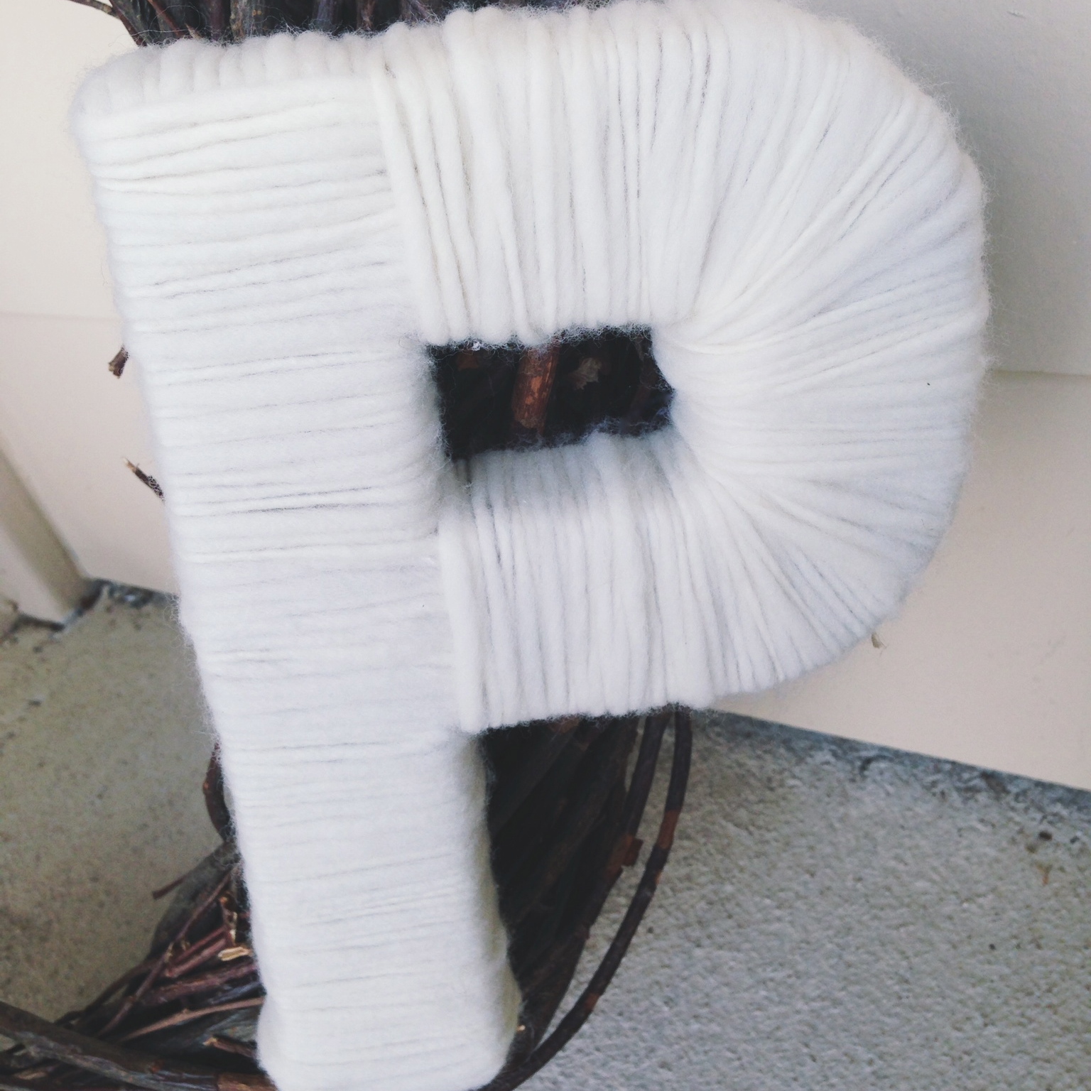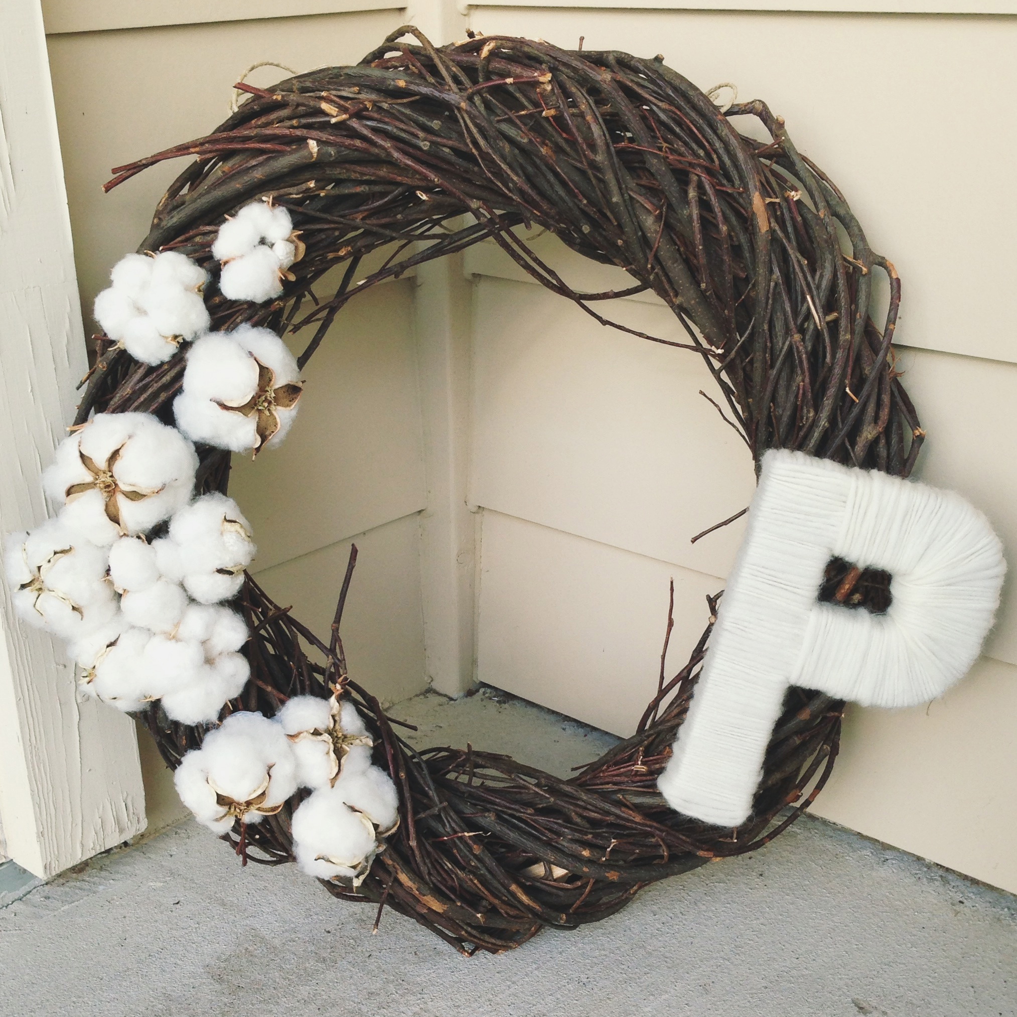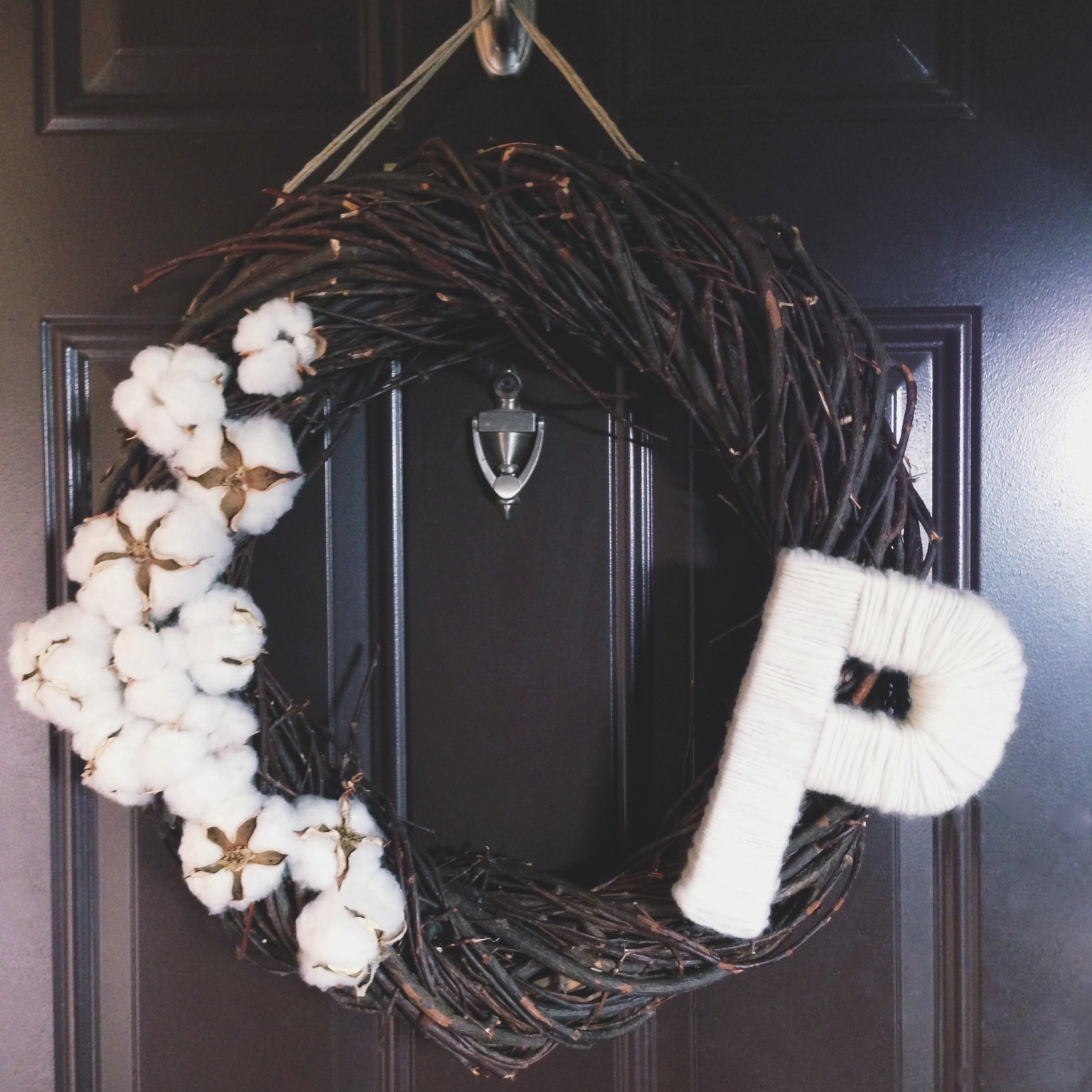 I’ve been thinking about a Fall wreath for a long time, I really wanted to create something with a cozy and natural look. What I used: a twig wreath, cotton bolls, hand spun yarn (wrapped around a cardboard letter), hemp twine (for hanging), and I pulled it all together with a hot glue gun.