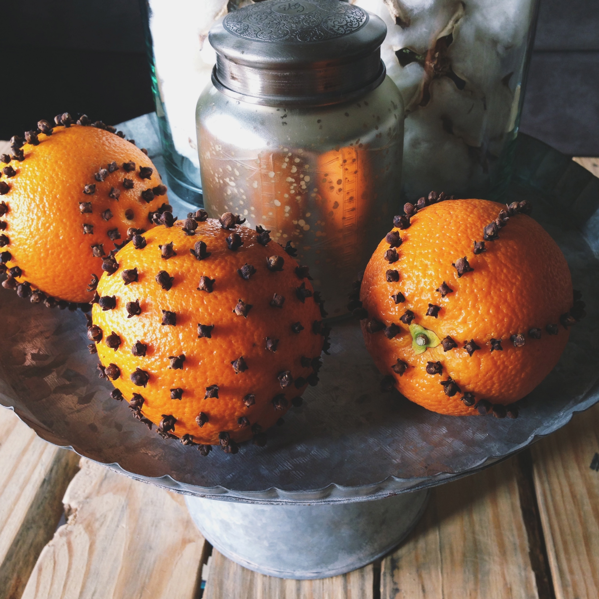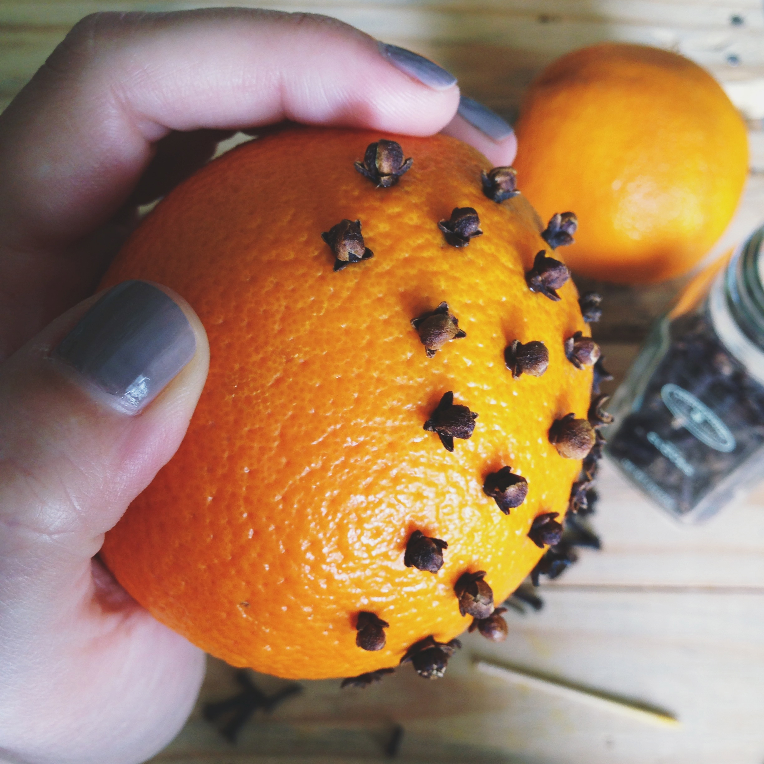 Using a toothpick, make a small hole in the skin of the orange and insert a clove. Continue this process in whatever pattern you like!