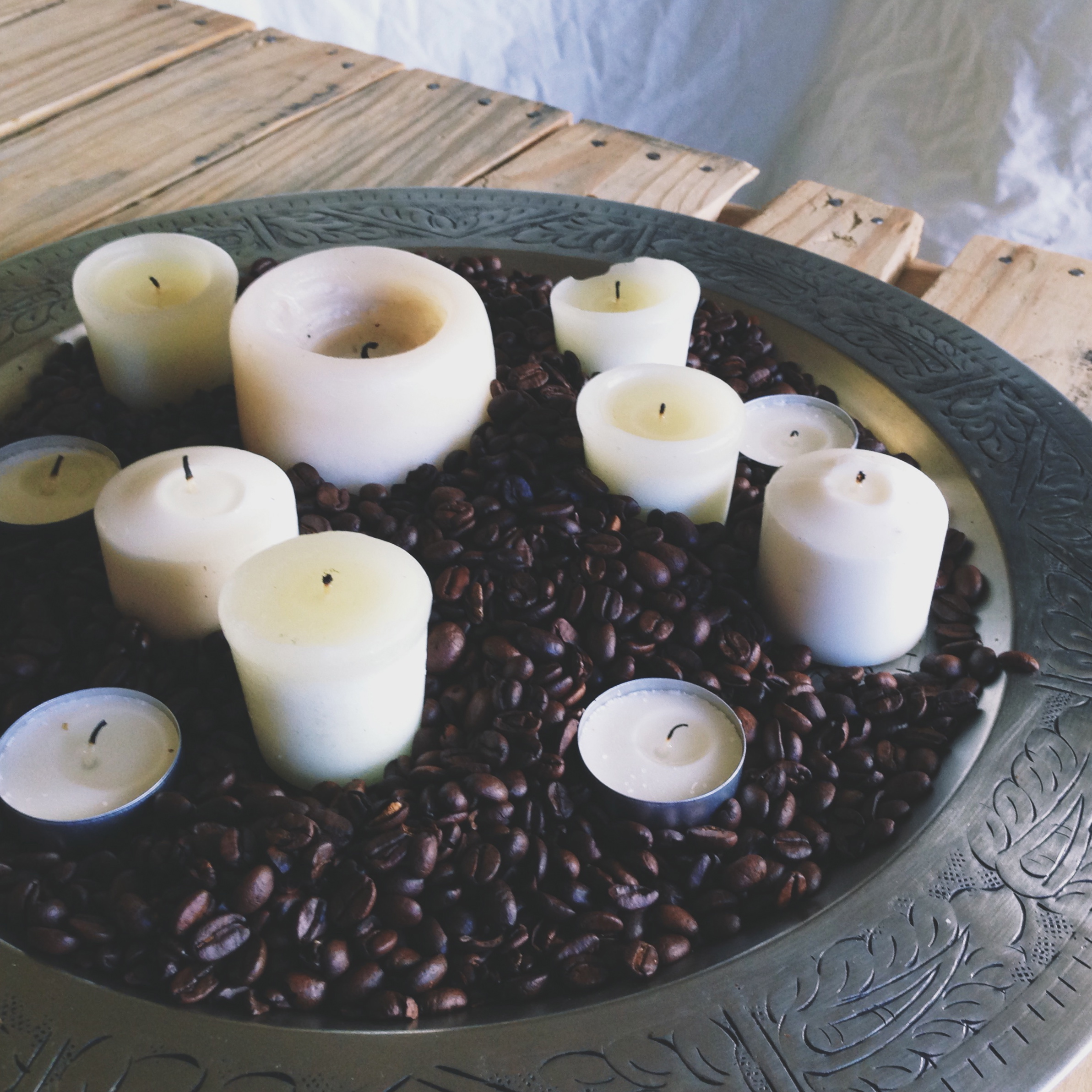 Grab a pretty tray, plate, or platter. Gather extra candles and arrange them on your tray. Coffee beans are a great filler to use with candles! Simply pour them around your candle arrangement. Coffee beans put off an amazing scent as they’re heated by the warmth of burning candles!