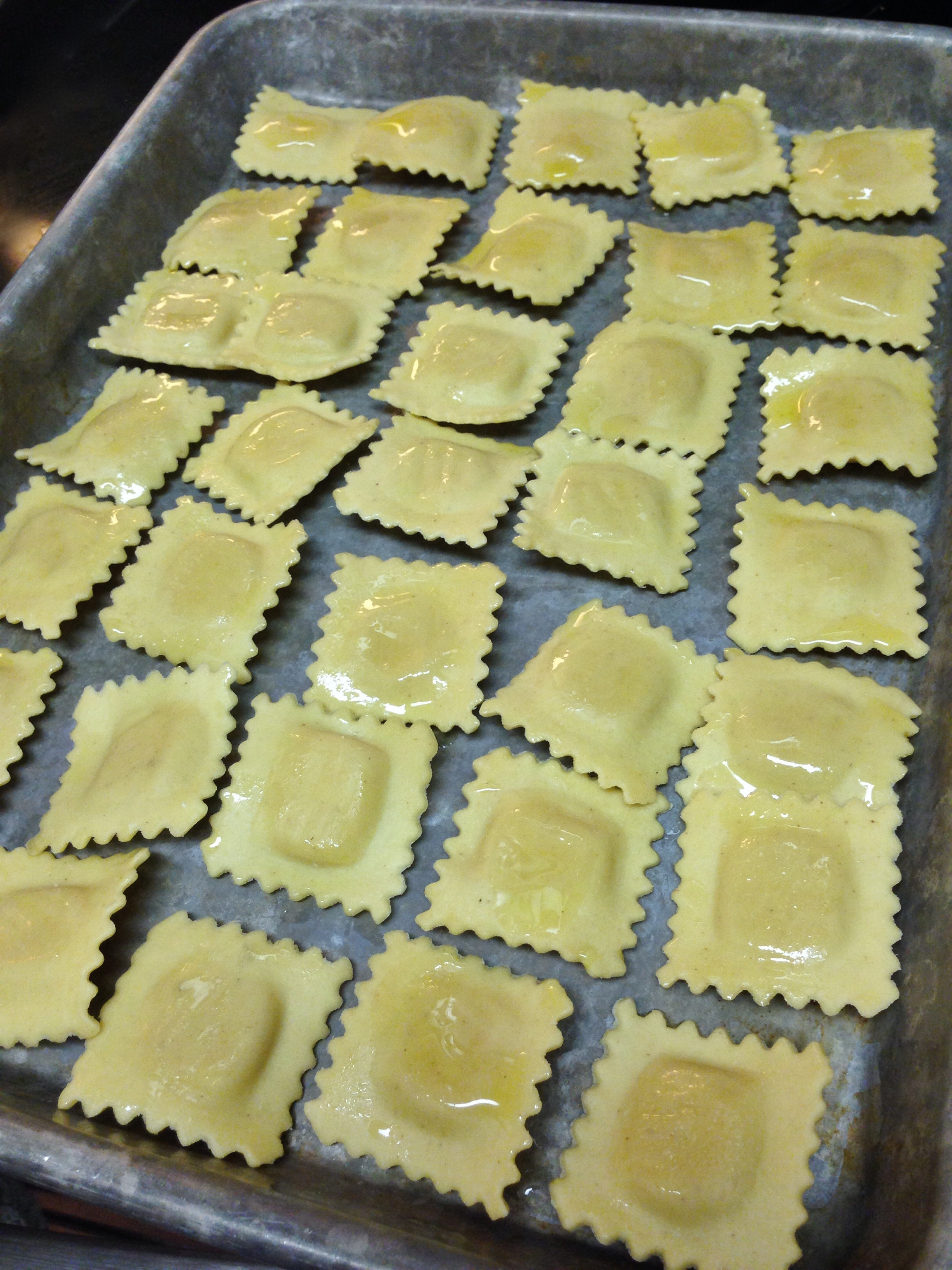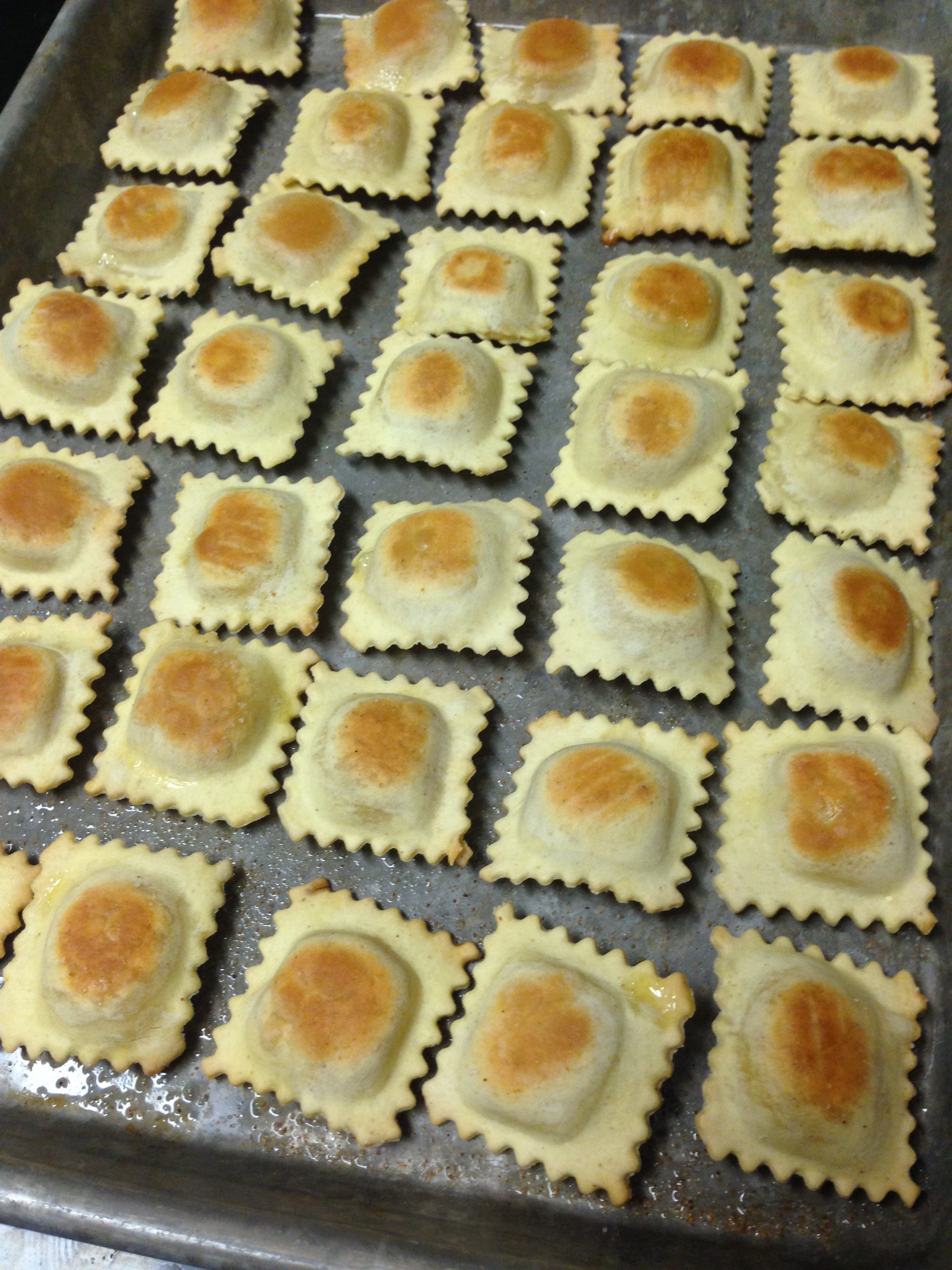 Preheat oven to 350. Lay ravioli out on a sheet pan. Brush both sides of ravioli with olive oil. Sprinkle with garlic salt (I found that a lot of it fell off, so you can give the ravioli a good coating). Bake for 8 minutes, flip ravioli and bake for 8 more minutes. Serve right away!