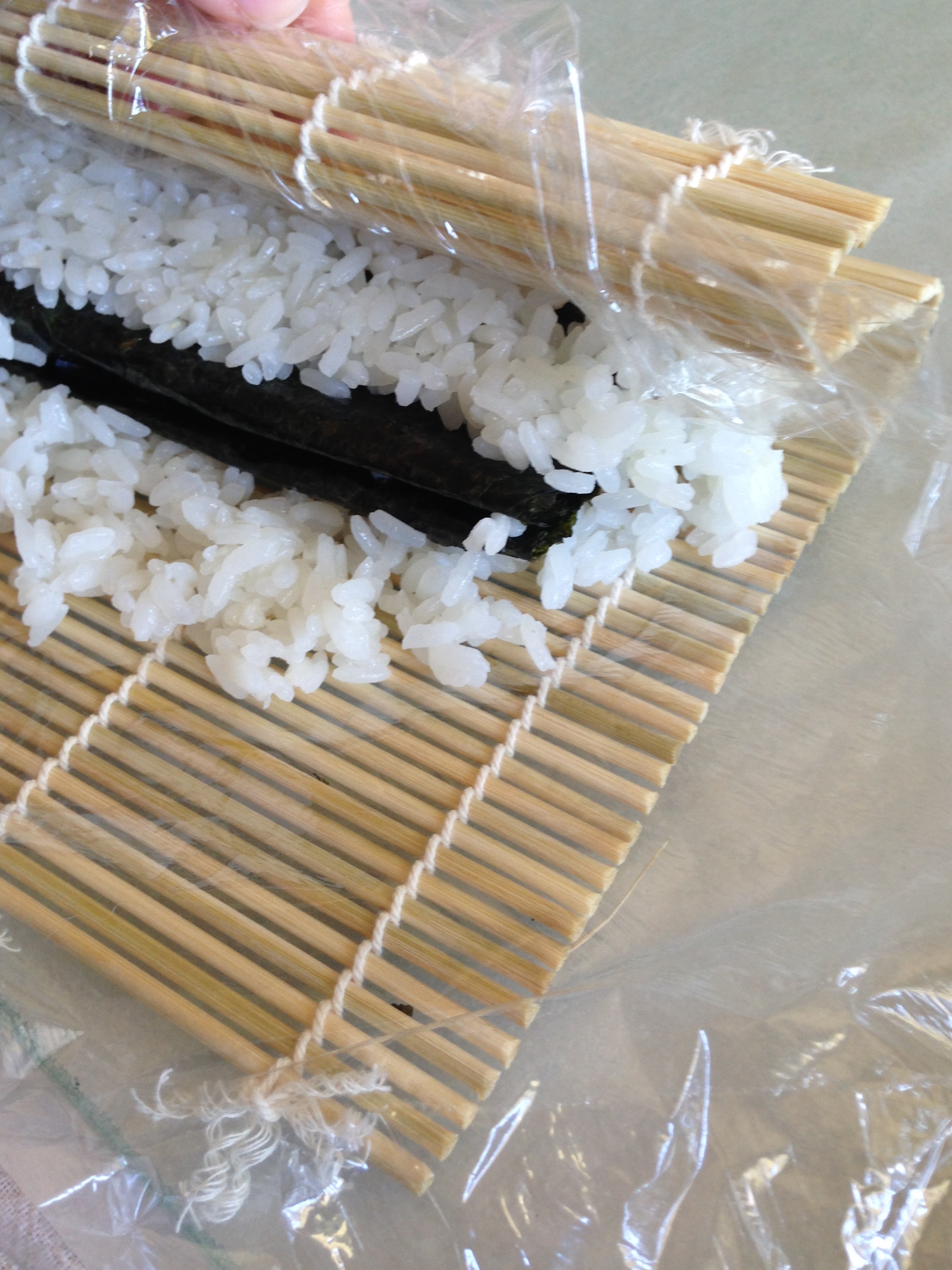 For making a reverse roll (rice on the outside), wrap the mat in plastic wrap. Spread rice out directly onto the mat, then place nori sheet and fillings on top of that. Dip your fingers and knife in water to make handling and cutting the reverse roll easier.