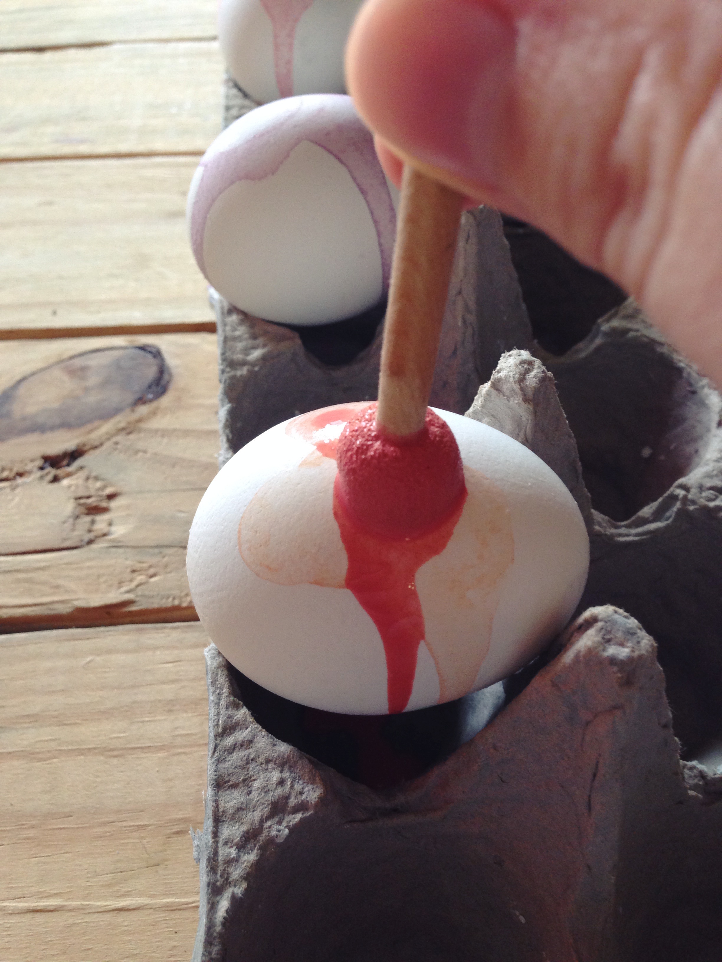 Start by wetting a sponge brush and then swirling it in the paint. For each of my eggs, I started with a concentrated color. Press sponge brush onto the egg and let paint run down the sides. Repeat this process until you’ve achieved the pattern that you want.