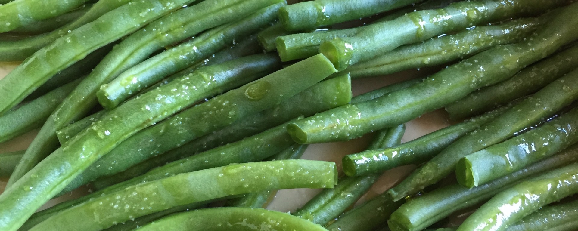 Mix together equal parts olive oil and maple syrup and drizzle over green beans. Sprinkle with salt. Bake for 15 minutes, then stir green beans to make sure that they’re well coated with the glaze. Let them cook for 15 minutes more, or until green beans are nice an tender.