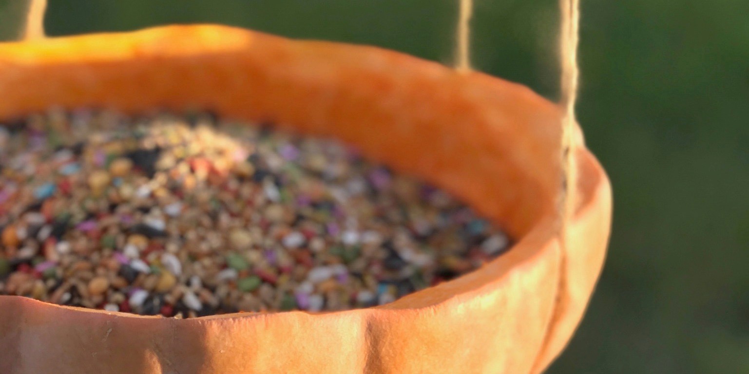We have a huge tree out front, it’s my favorite thing about our yard, something that’s pretty rare to find in a new-ish subdivision in our area. Over the Spring and Summer, several batches of birds were hatched in different nests that were built in our tree. It’s so fun to watch them grow and explore the yard when they are big enough to leave their nests. I really find a lot of inspiration on instagram and when I saw this post I knew that I wanted to make one of these pumpkin bird feeders for my bird friends.
